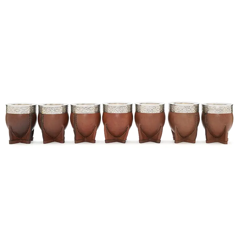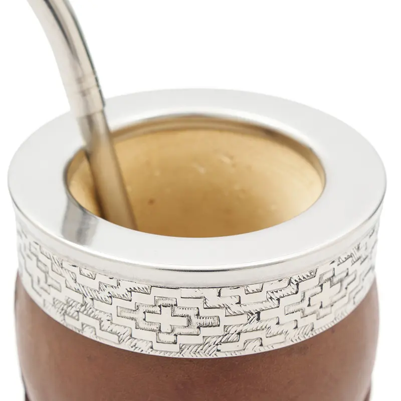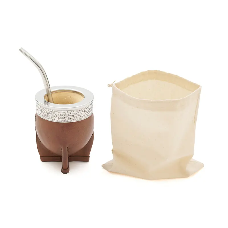 Mate de calabaza tipo imperial modelado en cuero vaqueta vacuno, cuenta con virola superior de acero inoxidable pulido espejo con un diseño de guarda pampa grabado. Incluye bombilla pico de loro y una bolsa de algodón de 20 x 20cm.