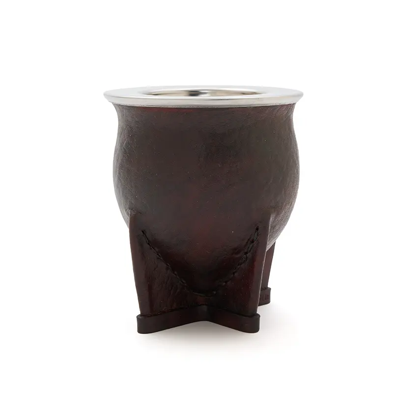 Mate de calabaza tipo camionero moldeado en cuero vacuno con aro de acero inoxidable pulido espejo. Es ideal para uso diario, campañas institucionales o packs promocionales. Incluye bombilla pico de loro y una bolsa de algodón de 20 x 20cm.
